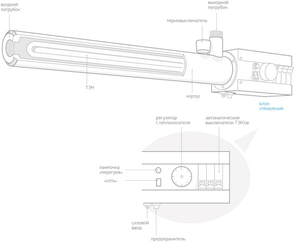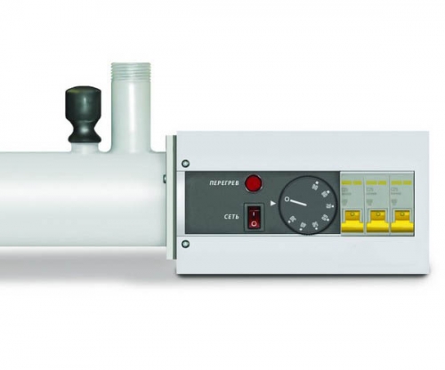 Электрический котел снабжен термоограничителем, который отключает электронагреватель по достижении предельной температуры воды, что позволяет избежать перегрева теплоносителя.