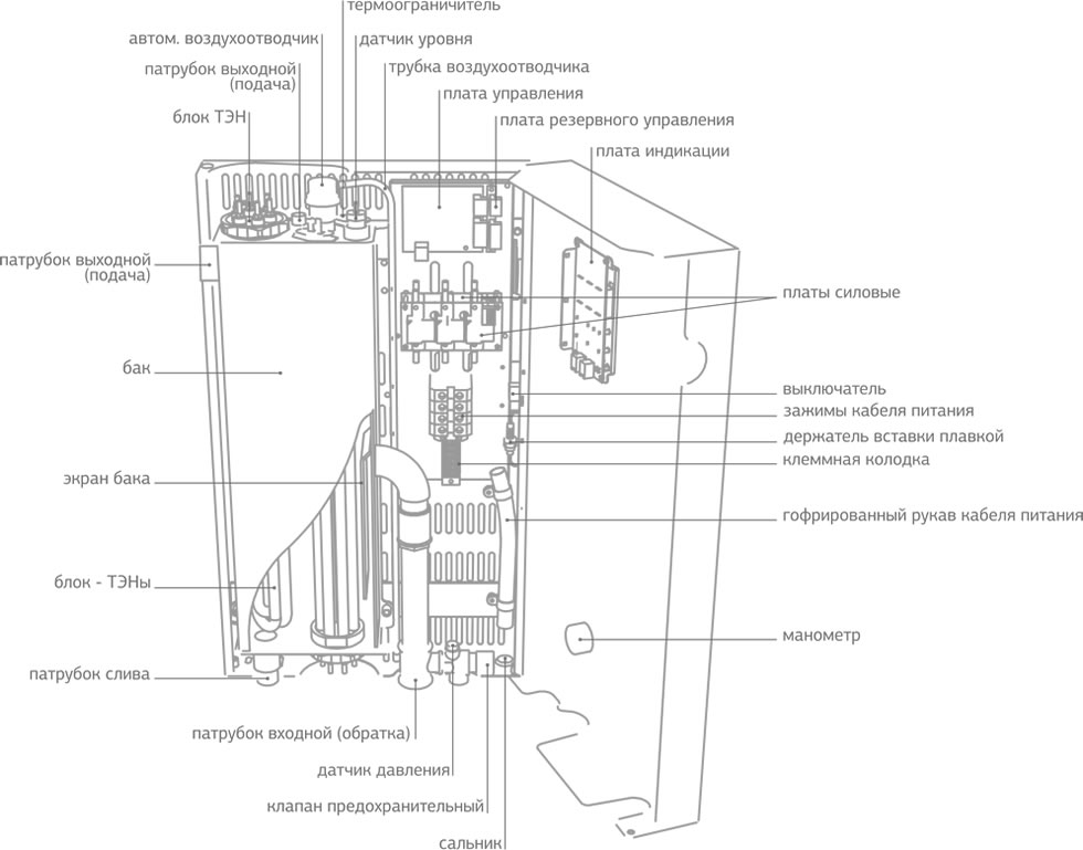 Электрический котел снабжен термоограничителем, который отключает электронагреватель по достижении предельной температуры воды, что позволяет избежать перегрева теплоносителя.