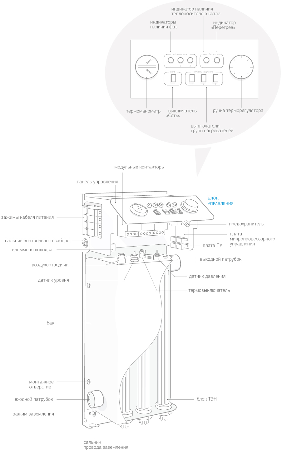 В верхней части корпуса прибора установлен датчик уровня (наличия теплоносителя), он обеспечивает отключение питания электрокотла в случае отсутствия теплоносителя в баке.