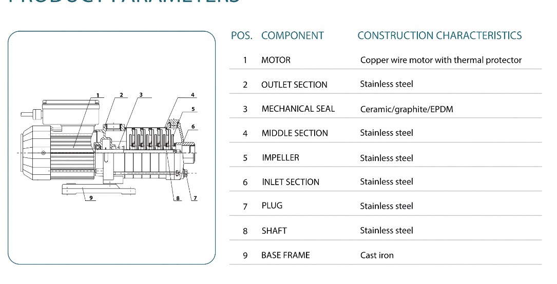 Серия CHJ - это многоступенчатый насос из нержавеющей стали, ориентированный на корпус: Жидкостная часть изготовлена из SUS304. При обработке передовым сварочным оборудованием, термообработке, напряжение, вызванное торцевым разрезом пластины при растяжении и прессовании, устраняется, чтобы сделать высокую прочность, отсутствие деформации, длительный срок службы, безопасное и надежное использование; Применяемый тип механического уплотнения обеспечивает водонепроницаемость при длительной непрерывной работе. Материал рамы - алюминий; низкий уровень шума и вибрации, долговечность. Класс изоляции B, защита IPX55, непрерывная работа; однофазный с термопротектором от T1 для обеспечения безопасности и удобства.