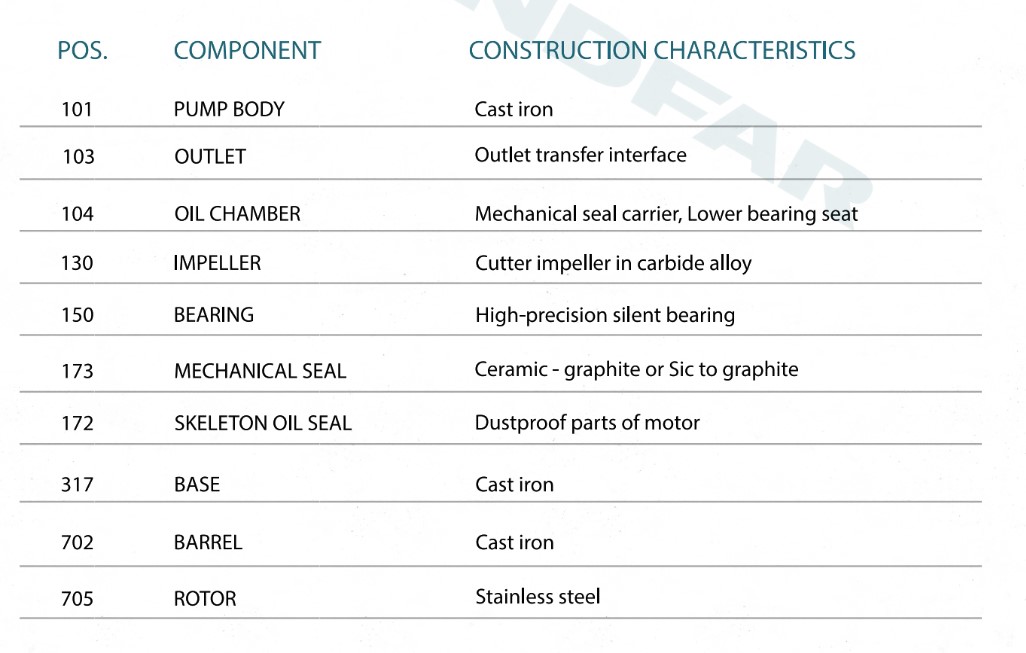 Корпус насоса Чугунная крыльчатка Крыльчатка с твердосплавной насечкой Крепления двигателя: Чугун Чугунный вал Нержавеющая сталь Механические уплотнения Керамико-графитовые или кремний-графитовые. Изоляция: класс F. Класс защиты: IP X8.