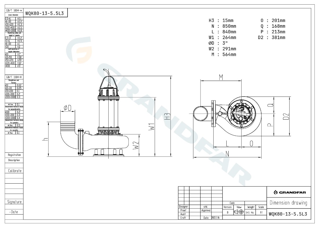 Канализационный погружной насос GRANDFAR WQK250-22-30L3