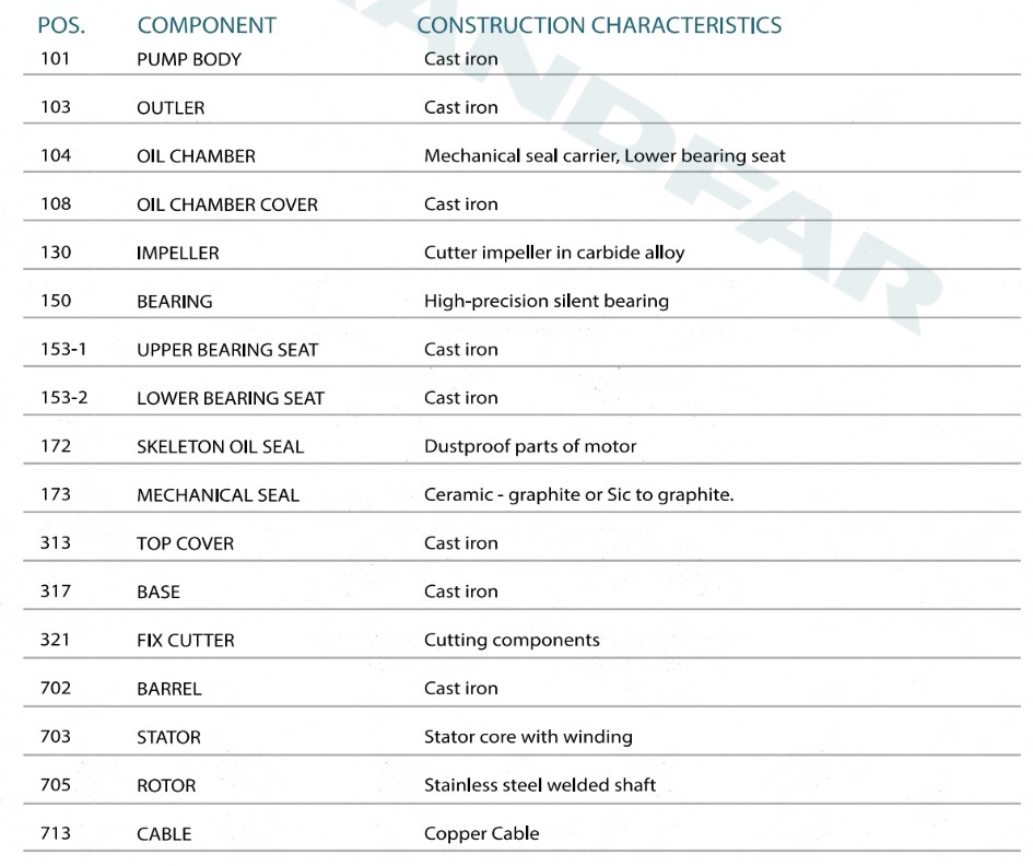 Корпус насоса: Чугун Рабочее колесо: Крыльчатка из твердосплавного сплава Кронштейн двигателя: Чугун Вал двигателя: Нержавеющая сталь Механическое уплотнение: Керамика - графит или Sic на графите. Изоляция: Класс F. Защита: IP X8.